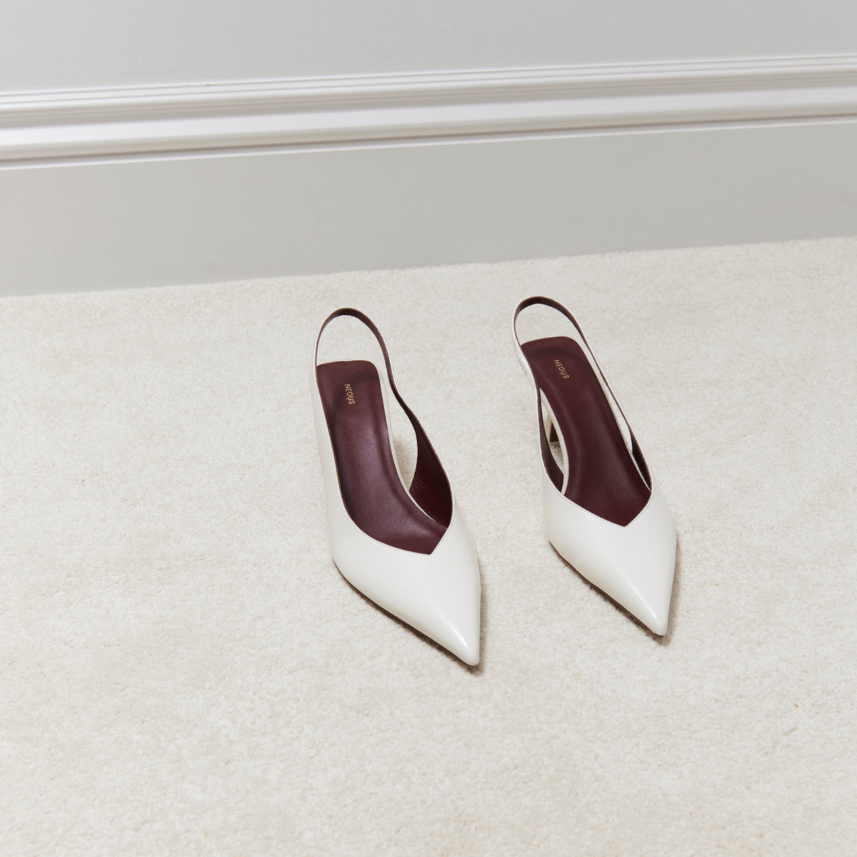 MORIAH is a seamless slingback crafted in smooth leather, which sits in contrast with the suede of its sharp and squared-off heel. MORIAH’s elongated and pointed toe is mirrored in the cut of the upper and embodies the directional silhouettes NEOUS has become known and loved for.