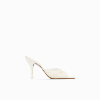 Introducing the SYRMA, a playful mule sandal that features a rounded toe shape atop a curved 85mm lacquered heel. Adorned with contrasting textural threads that gracefully entwine around the foot, this sandal exudes creativity and artistic flair, A true statement piece.
