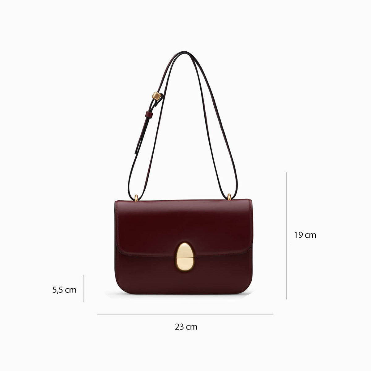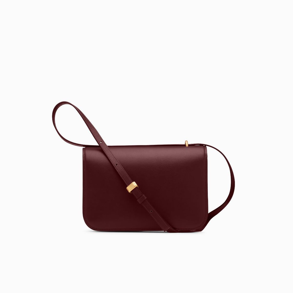 A compact timeless classic with an adjustable strap that can be worn across the body or carried on the shoulder, secured with a bespoke spherical magnetic closure in a vintage gold finish.